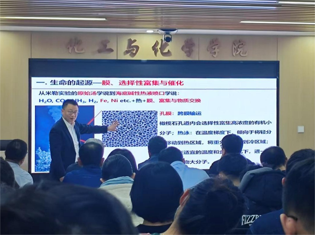Professor Prof. Bo Wang began by recounting the origins of life, detailing his research journey and describing his group's focus on key separation and mass transfer processes in the clean energy field. He described their technology for constructing biomimetic framework materials with both selective recognition and efficient transport capabilities, providing a vivid academic report for the faculty and students present.