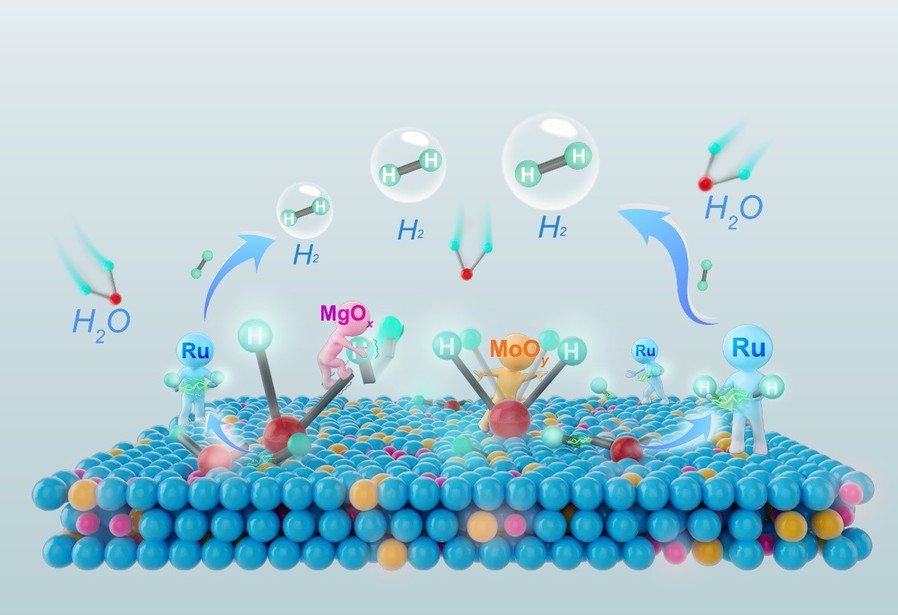 Recently, a research team led by Professor Yu Yongsheng (于永生), a faculty member of the School and the State Key Laboratory of Urban Water Resources and Water Environment, and Associate Professor Yang Weiwei (杨微微), in collaboration with Professor Guo Shaojun (郭少军)'s team from Peking University, has achieved a breakthrough in the field of electrocatalytic hydrogen evolution. They proposed a salt-templating method to introduce oxygenophilic Mg and Mo sites onto amorphous Ru metallene, which significantly enhances the alkaline hydrogen evolution reaction (HER) electrocatalytic performance through the synergistic promotion of water adsorption and splitting. The research findings, titled "Synergetic Oxidized Mg and Mo Sites on Amorphous Ru Metallene Boost Hydrogen Evolution Electrocatalysis," have been published in Advanced Materials. This work holds significant value as it not only deepens our understanding of the water - splitting reaction mechanism but also offers new perspectives for the development of efficient electrocatalysts. Consequently, it shows great promise in promoting the advancement of renewable energy development.Hydrogen is favored due to its high energy density, high combustion efficiency, and clean, pollution-free nature. Nevertheless, the slow water splitting reaction poses a severe limitation to the development of alkaline water electrolysis for hydrogen production. Ruthenium (Ru), as a relatively low-cost catalyst, shows platinum-like high activity in the alkaline hydrogen evolution reaction (HER). However, its insufficient hydrophilicity restricts the water splitting efficiency. The introduction of oxygenophilic species can enhance the activation and splitting of water molecules.Regrettably, current research in this area is still inadequate.