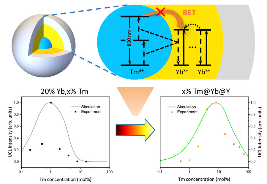 The team developed a hexagonal-phase NaYF₄-based heterostructured core–shell–shell nanostructure (NaYF₄:Tm³⁺@NaYbF₄@NaYF₄), in which the activator ions (Tm³⁺) and sensitizer ions (Yb³⁺) are spatially confined within the inner core and the intermediate shell, respectively, while the outermost inert shell is employed to suppress surface quenching effects. This rational design enables effective suppression of concentration quenching at excitation power densities below 100 W cm-2, increasing the optimal Tm³⁺ doping concentration from 1% in conventional single-core co-doped NaYF₄:Yb³⁺/Tm³⁺ nanocrystals to 8%. Mechanistic investigations reveal that spatial separation of sensitizer and activator ions effectively suppresses back energy transfer from Tm³⁺ to Yb³⁺, thereby enabling a higher optimal Tm³⁺ doping concentration. Moreover, under high excitation power density (20 MW cm-2), the optimal Tm³⁺ doping level can be further increased to 50%. These findings deepen the understanding of concentration quenching in lanthanide luminescence and provide new opportunities for the development of high-brightness rare-earth upconversion materials.