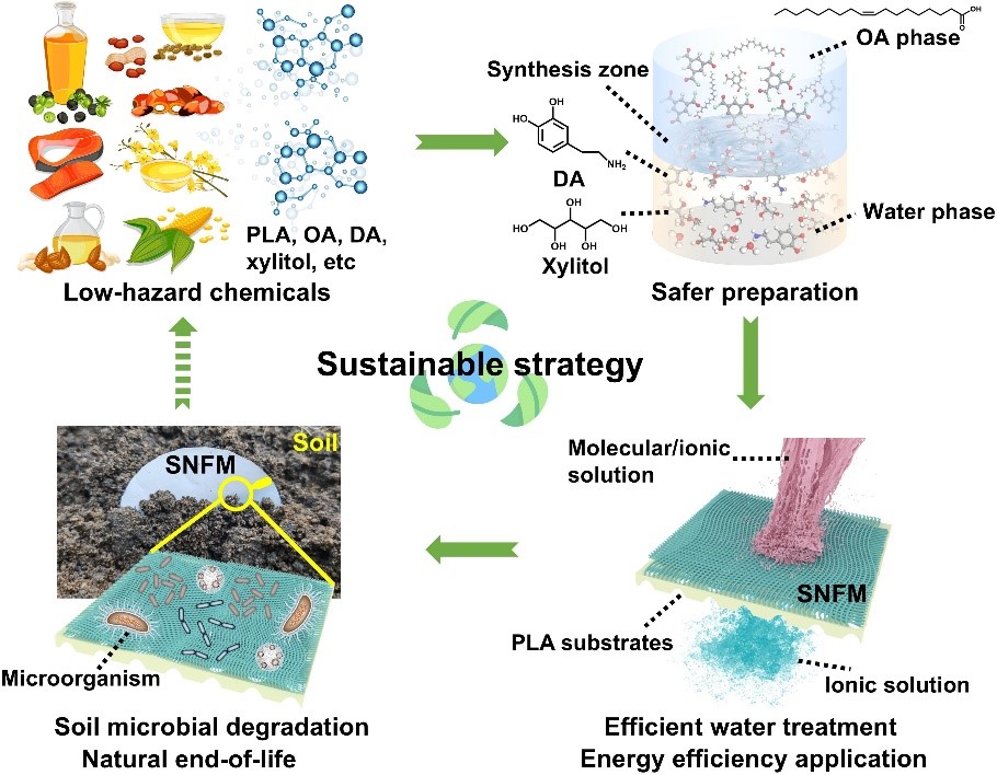 To address the aforementioned bottlenecks, the team, guided by the principles of green chemistry, established a novel green and sustainable NF membrane system, guided by the principles of green chemistry. The sustainable nanofiltration membrane (SNFM) uses polylactic acid (PLA) as the substrate, adopts low-hazard chemicals such as xylitol, dopamine (DA) and oleic acid (OA), and constructs a unique wavy nano-selective layer via interfacial polymerization.This approach has two significant advantages. Firstly, it avoids the use of conventional high - risk solvents. Secondly, it endows the membrane with the ability to be biodegraded by microorganisms in natural soil environments, thus achieving full - life - cycle membrane - based water purification.