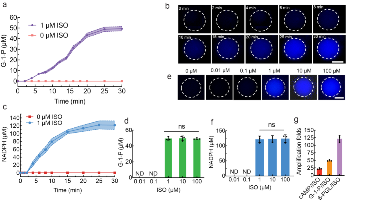 To overcome this limitation, the team reconstituted β2-adrenergic receptor (ADRB2), Gs protein α subunit (Gsα), and adenylyl cyclase V (ADCY5) within artificial cells, successfully establishing a complete signal transduction pathway. Upon binding of the extracellular first messenger isoproterenol (ISO) to ADRB2, Gsα is activated and subsequently stimulates ADCY5 to generate the second messenger cyclic adenosine monophosphate (cAMP). cAMP then activates protein kinase A (PKA), triggering a phosphorylation cascade of phosphorylase kinase (PhK) and glycogen phosphorylase (PYGM) required for glycogenolysis. As a result, glycogen is converted into glucose-1-phosphate (G-1-P), which is further transformed enzymatically into 6-phosphogluconolactone and NADPH. Throughout the signal transduction process, the artificial cells exhibit a hierarchical signal amplification cascade, from ISO to cAMP, G-1-P, and 6-phosphogluconolactone. This work represents the first demonstration of complete GPCR-mediated signal transduction and metabolic regulation in artificial cells, providing a solid foundation for the development of artificial cells with autonomous sensing, response, and regulatory capabilities.